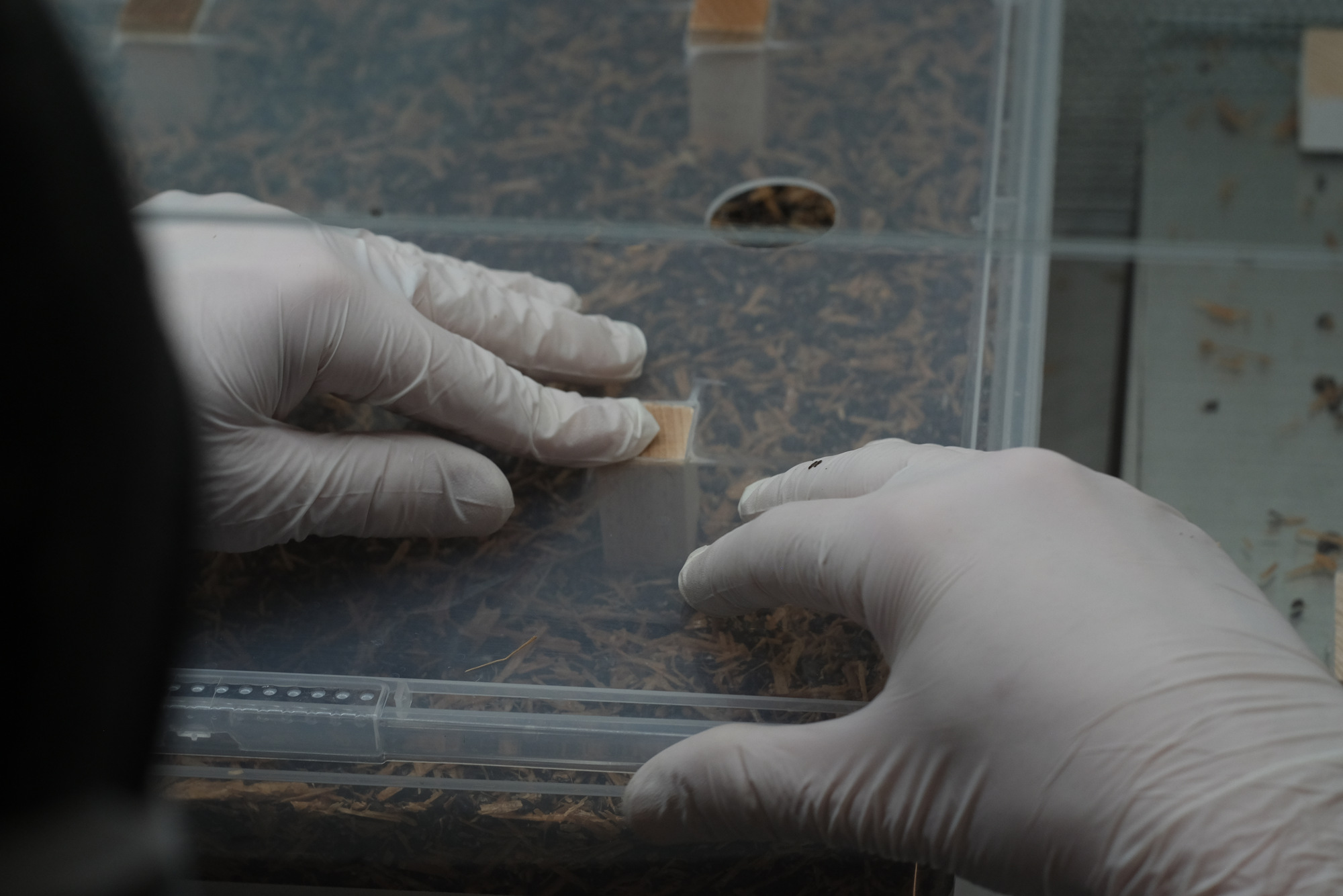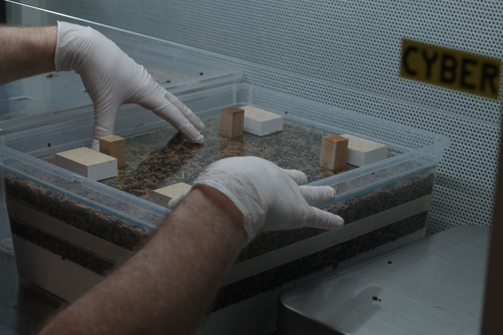 Nachdem 2 Beutel zerkleinert wurden, wird die Box von außen desinfiziert und auf die Arbeitsfläche des Laminarströmungsabzugs gelegt und die entsprechende Form befüllt.