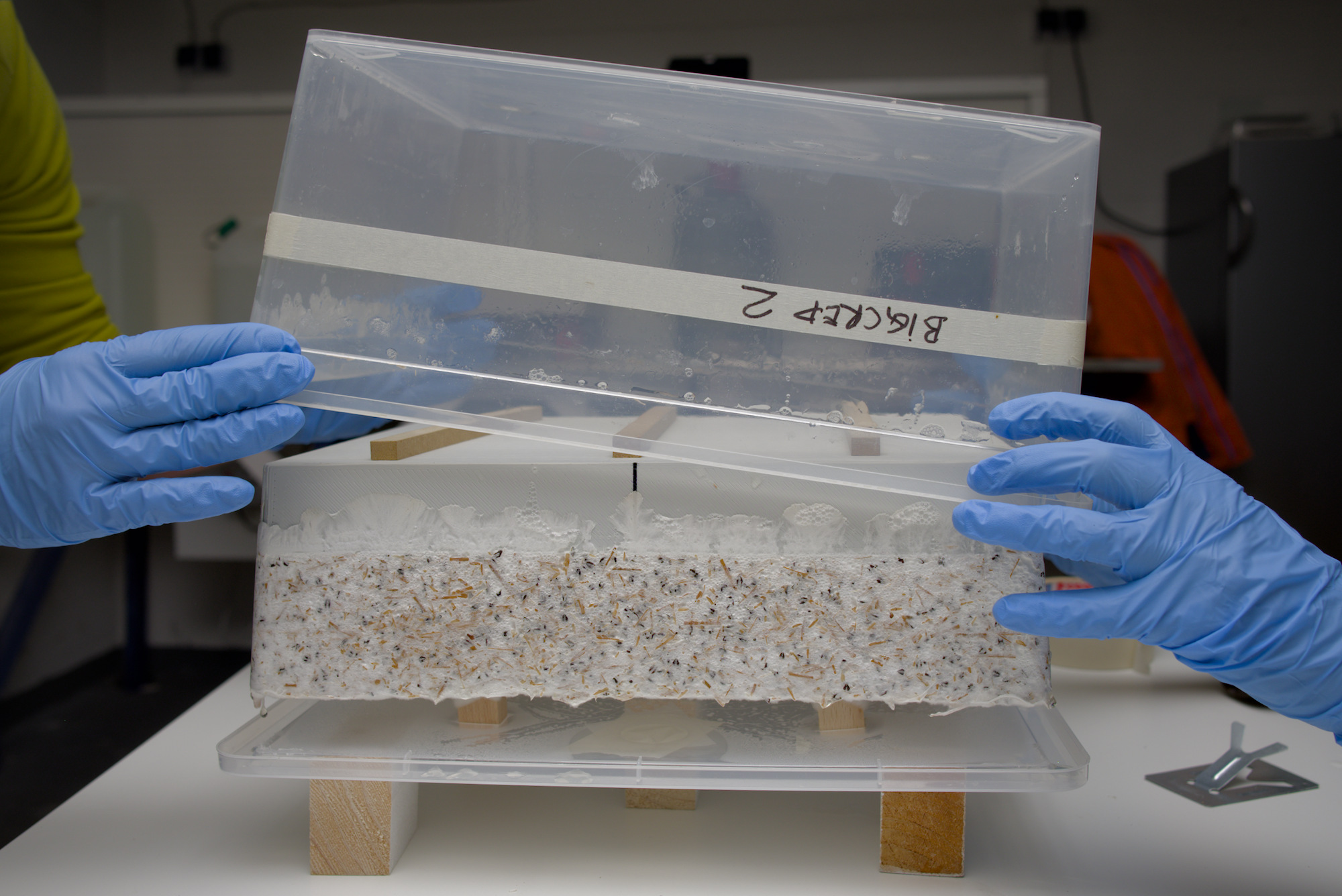 Nun kann das Myzel umgedreht werden. Es liegt nun mit der Rückseite auf dem Deckel auf und die Holzanker schauen nach unten heraus. Im Anschluss kann die Negativform entfernt werden. Die Aufbewahrungsbox wird erneut aufgesetzt, um ein Austrocknen des Myzels zu verhindern.