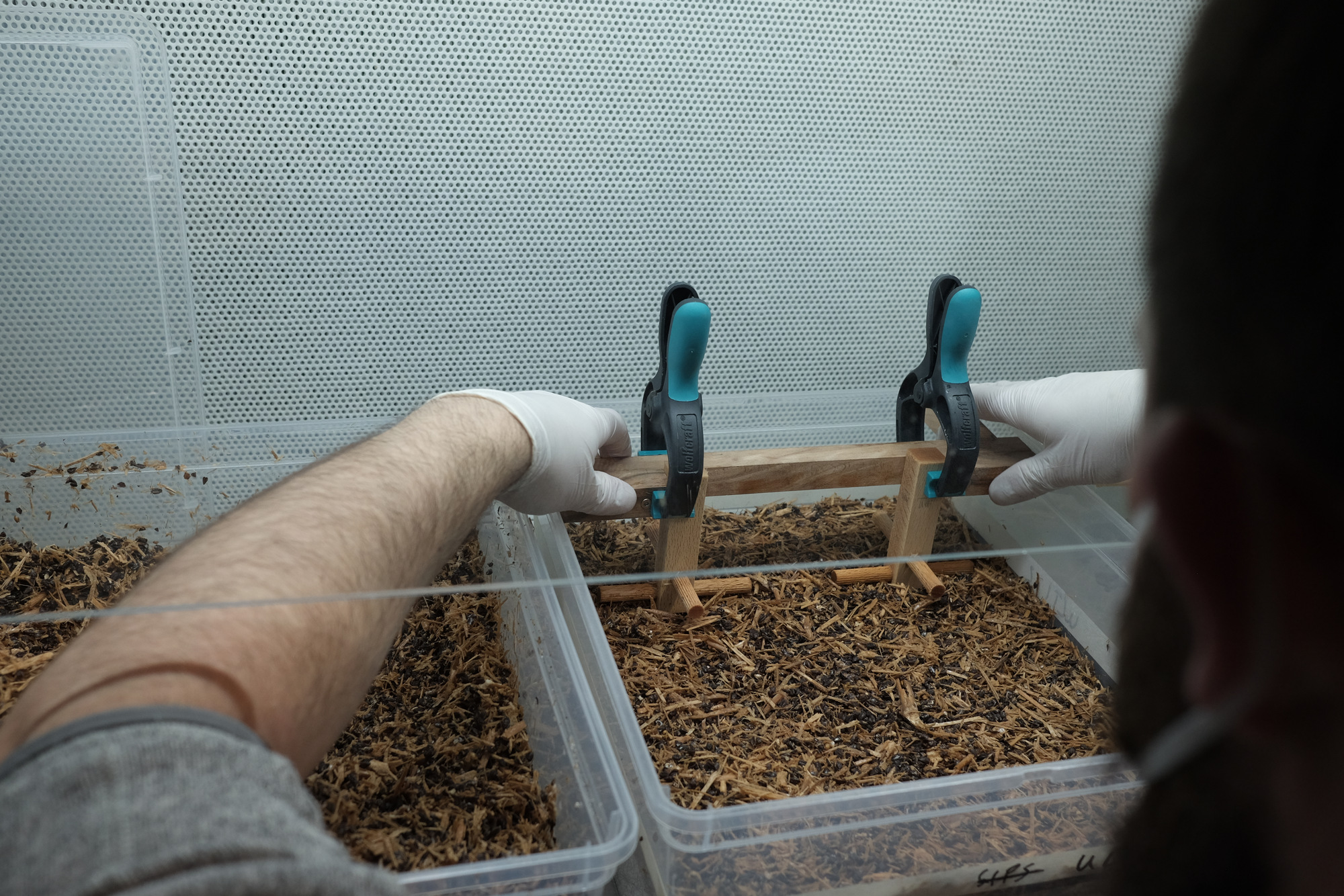 Die Form wird nach gründlichem Desinfizieren mit dem zerkleinerten Myzel befüllt. Die desinfizierten Holzanker werden dabei eingebettet.