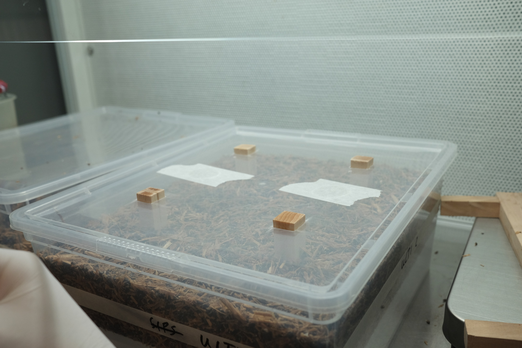 Nun kann das Myzel umgedreht werden. Es liegt nun mit der Rückseite auf dem Deckel auf und die Holzanker schauen nach unten heraus. Im Anschluss kann die Negativform entfernt werden. Die Aufbewahrungsbox wird erneut aufgesetzt, um ein Austrocknen des Myzels zu verhindern.