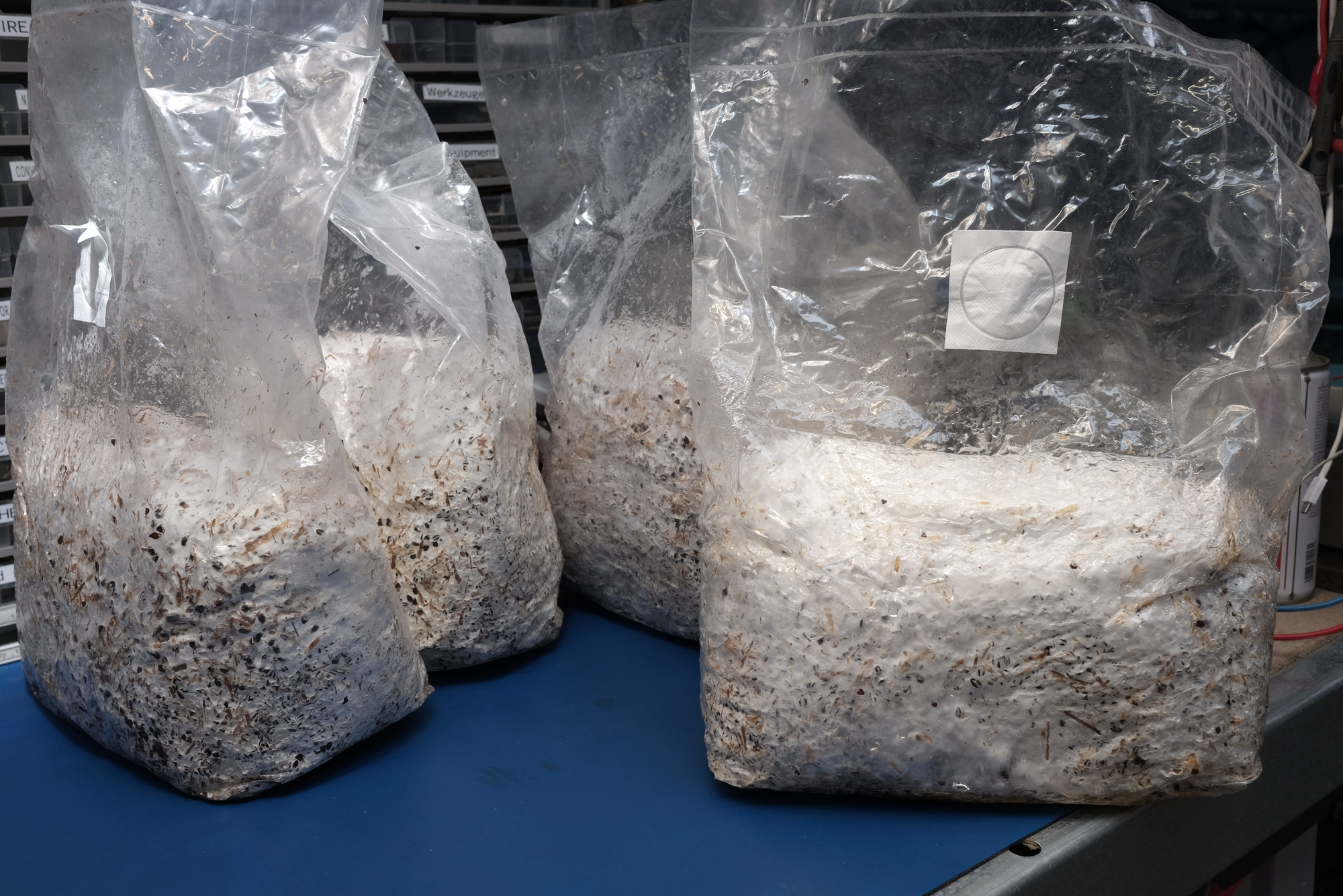 Ist das Substrat zu mehr als 90% durchwachsen, kann es weiterverarbeitet werden. Die Durchwachsung nimmt ca. 1 Woche in Anspruch.