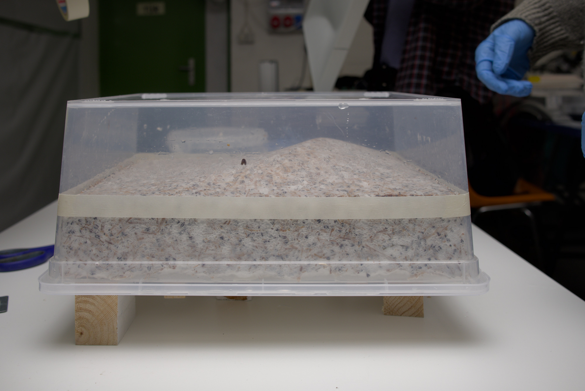 Nun kann das Myzel umgedreht werden. Es liegt nun mit der Rückseite auf dem Deckel auf und die Holzanker schauen nach unten heraus. Im Anschluss kann die Negativform entfernt werden. Die Aufbewahrungsbox wird erneut aufgesetzt, um ein Austrocknen des Myzels zu verhindern.