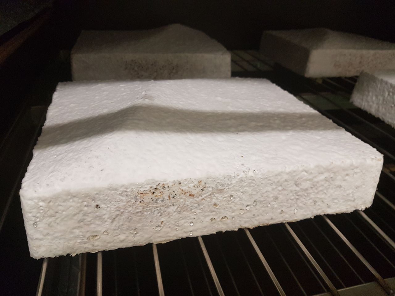 Die gedrehten Paneele werden in dem wenige Zentimeter breiten Spalt zwischen Myzeloberfläche und Wachstumsform sogenanntes Luftmyzel bilden - eine Schicht, die sich bis zu 1 cm stark auflagert. Die Oberfläche sieht am Ende dieses Prozesses wattig aus und erinnert an die Oberfläche eines Camembert. Dieses Luftmyzel erzeugt nach dem Trocknungsprozess eine ansprechende Optik und eine angenehm weiche Haptik.