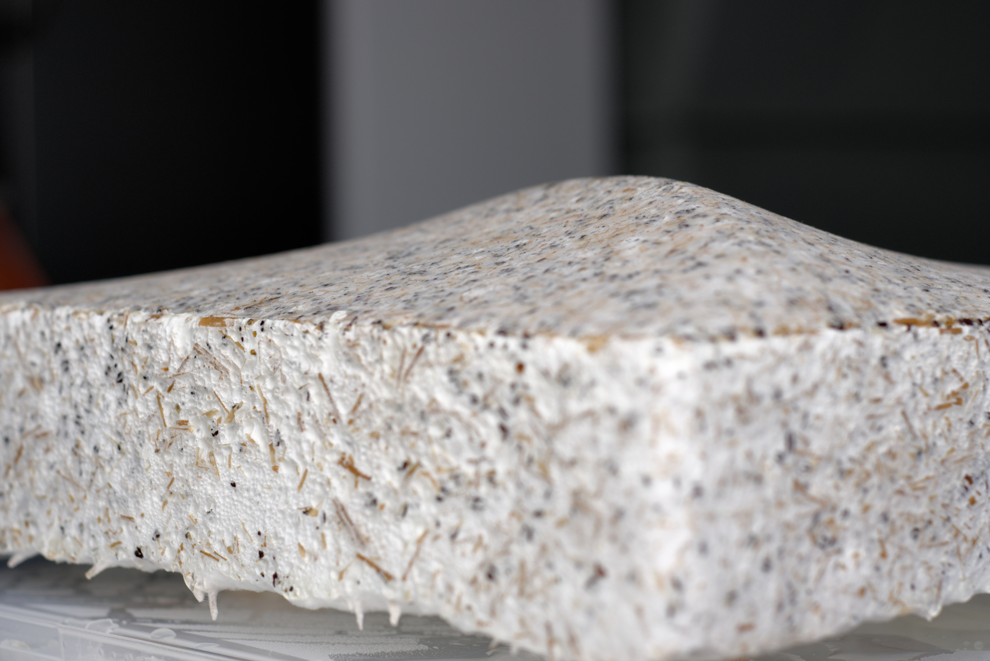 Die gedrehten Paneele werden in dem wenige Zentimeter breiten Spalt zwischen Myzeloberfläche und Wachstumsform sogenanntes Luftmyzel bilden - eine Schicht, die sich bis zu 1 cm stark auflagert. Die Oberfläche sieht am Ende dieses Prozesses wattig aus und erinnert an die Oberfläche eines Camembert. Dieses Luftmyzel erzeugt nach dem Trocknungsprozess eine ansprechende Optik und eine angenehm weiche Haptik.