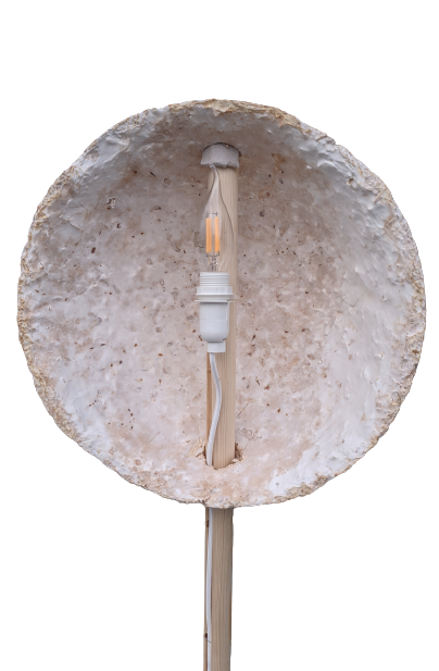 - Vorsichtig zwei 29 mm Ø Löcher in den Lampenschirm bohren, damit der Stiel durchgeführt werden kann. Achtung: Das Myzelmaterial kann ausbrechen und wegbröseln. Evtl. mit etwas Tape oder Papier sichern.